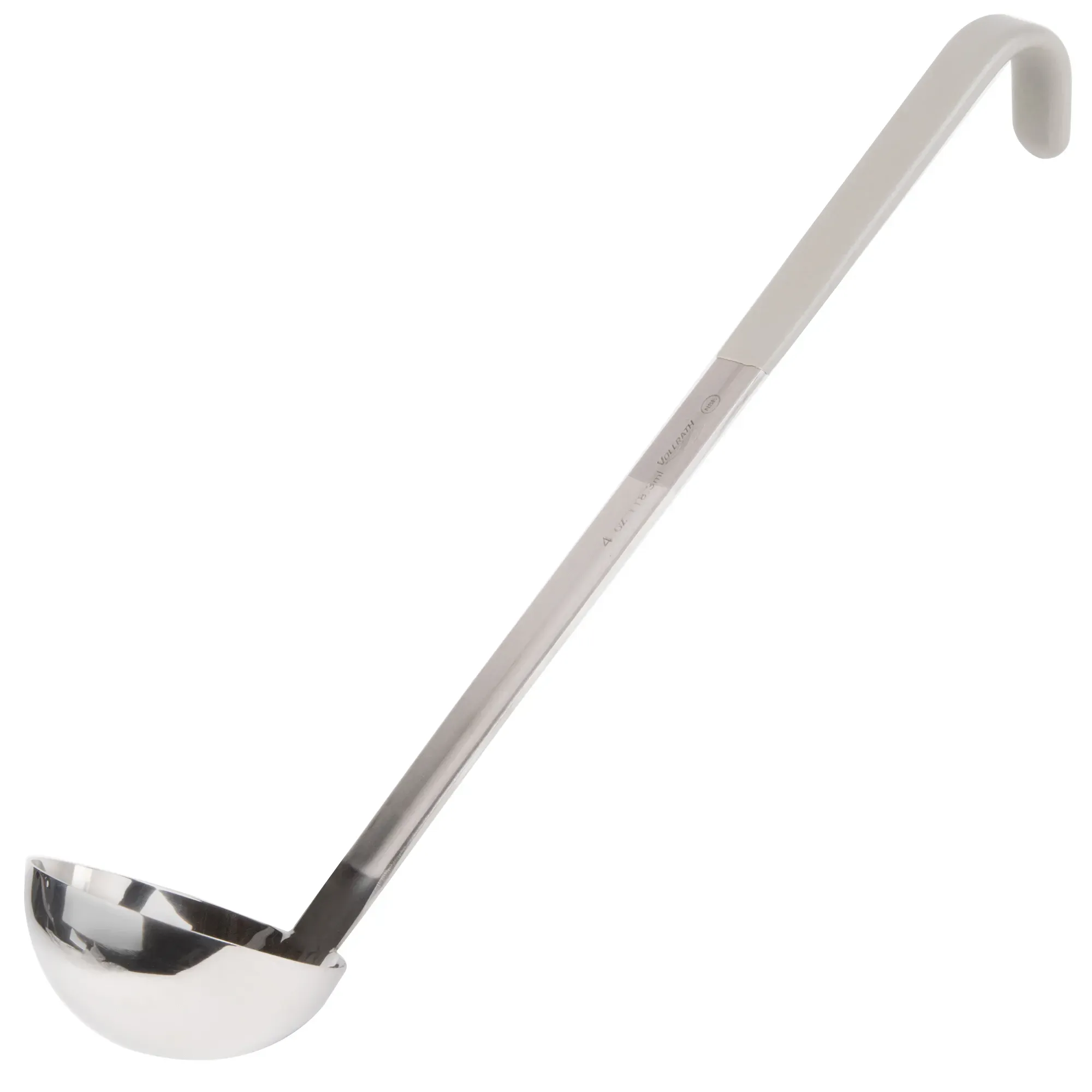 The stainless steel ladle by Vollrath helps you stir, scoop and serve with efficiency and ease. This versatile ladle is made of heavy-duty stainless steel that is fully functional up to 350°F and features a Kool-Touch handle. This insulated handle is color-safe up to 225°F, offers a comfortable grip and has all-natural antimicrobial properties. The precise bowl dimensions ensure accurate capacity, and the stamp on the handle allows for quick identification. With a hooked handle to prevent sliding into pots and a smooth, one-piece design, this ladle is easy to clean and a valuable addition to any kitchen.