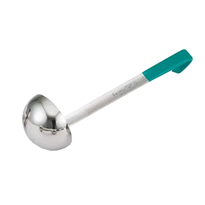 Transform your food service with the Vollrath 4980655 Ladle. This ladle is equipped with all-natural antimicrobial properties, ensuring a hygienic serving experience for your customers. Made from heavy-duty 18/8 stainless steel, this ladle is built to withstand the demands of a commercial restaurant kitchen. The 6 oz. (177.4 ml) capacity is perfect for portioning out soups, sauces, and other liquids. The grooved hooked teal Kool-Touch handle provides a comfortable grip and stays cool to the touch, preventing burns and ensuring safe handling. The mirror finish on the 3-1/2" bowl adds a touch of elegance to your presentation. With the stamped capacity in ounces and milliliters on the front side of the handle, you can easily measure and serve precise portions. NSF certified and backed by a Limited Lifetime Warranty, the Vollrath 4980655 Ladle is a reliable and durable tool for any commercial restaurant.