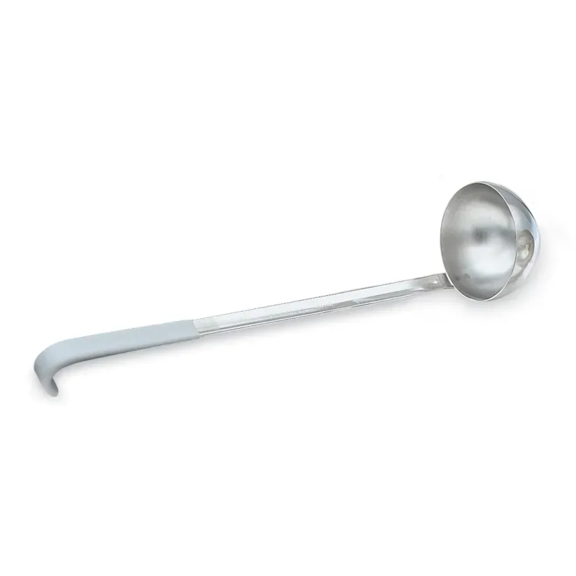 The heavy-duty ladle by Vollrath is designed for durability and versatility. Made of heavy-duty stainless steel, this strong ladle features a beautiful mirror finish and a grooved Kool-Touch handle that ensures a comfortable grip. This insulated handle is permanently bonded, so it will not fall off, and features all-natural antimicrobial properties that guard against harmful bacteria. The hooked design prevents the ladle from sliding into pots and has a capacity stamp for quick identification. The handle is color-safe up to 225°F, and the stainless steel ladle is fully functional up to 350°F, making it ideal for a wide range of hot food items.