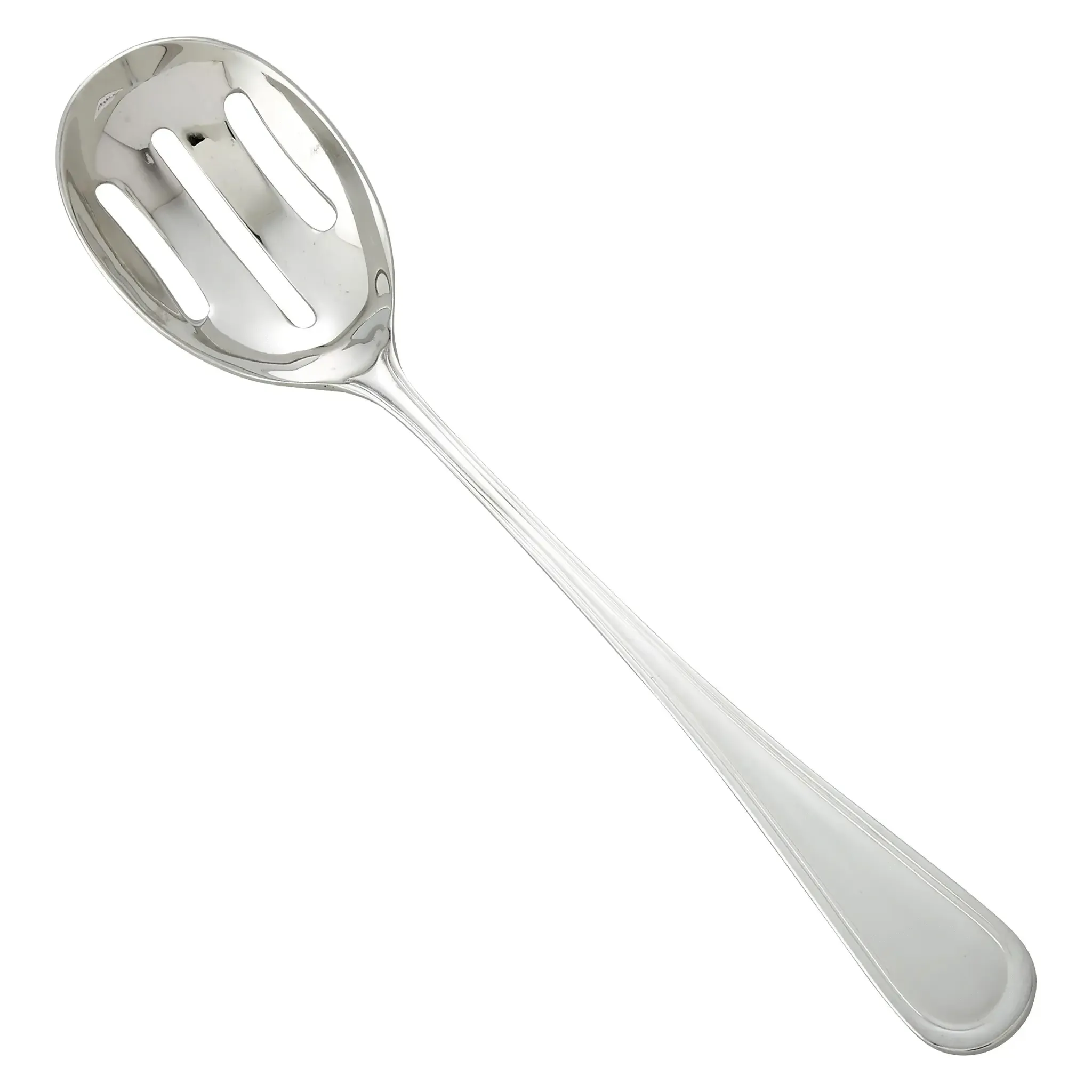 Perfect for everyday use in a bustling restaurant environment, the Winco Banquet Serving Spoon is an essential tool for any professional kitchen. Crafted from 18/8 stainless steel, this extra heavy-weight serving spoon is designed to withstand the rigors of daily use while maintaining its pristine appearance. The mirror finish adds a touch of elegance, making it suitable for both back-of-house operations and front-of-house presentations. The Winco Banquet Serving Spoon features a slotted design, allowing for efficient draining of liquids, making it ideal for serving vegetables, pasta, and other dishes that require straining. With a length of 11-12 inches, it provides ample reach and control, ensuring that your staff can serve guests with ease and precision. The Shangarila series, known for its durability and high-quality construction, ensures that this serving spoon will be a long-lasting addition to your restaurant's utensil collection. The extra heavy weight of the spoon offers a substantial feel, providing confidence and comfort during use. While the model number 0030-24 may not be immediately relevant to the day-to-day operations, it signifies the specific design and quality standards that Winco adheres to, ensuring you receive a product that meets professional-grade requirements. In summary, the Winco Banquet Serving Spoon is a versatile and reliable utensil that combines functionality with a sophisticated appearance. Its durable construction and elegant design make it a perfect choice for any restaurant looking to enhance its service efficiency and presentation.
