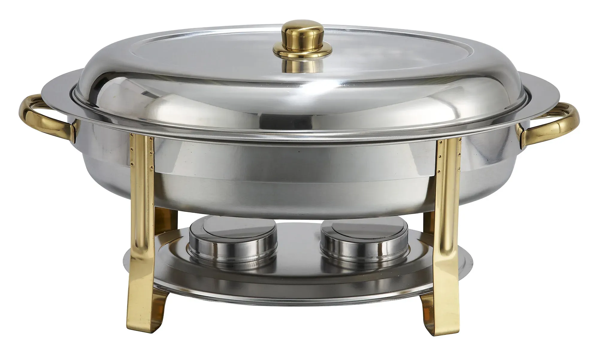 Elevate your buffet service with the Malibu Chafer 6 qt. Oval Stainless Steel Mirror Finish Cover with Gold Accents from Winco. This chafer is more than just a serving piece; it's a statement of quality and elegance that will impress your patrons and keep them coming back for more.