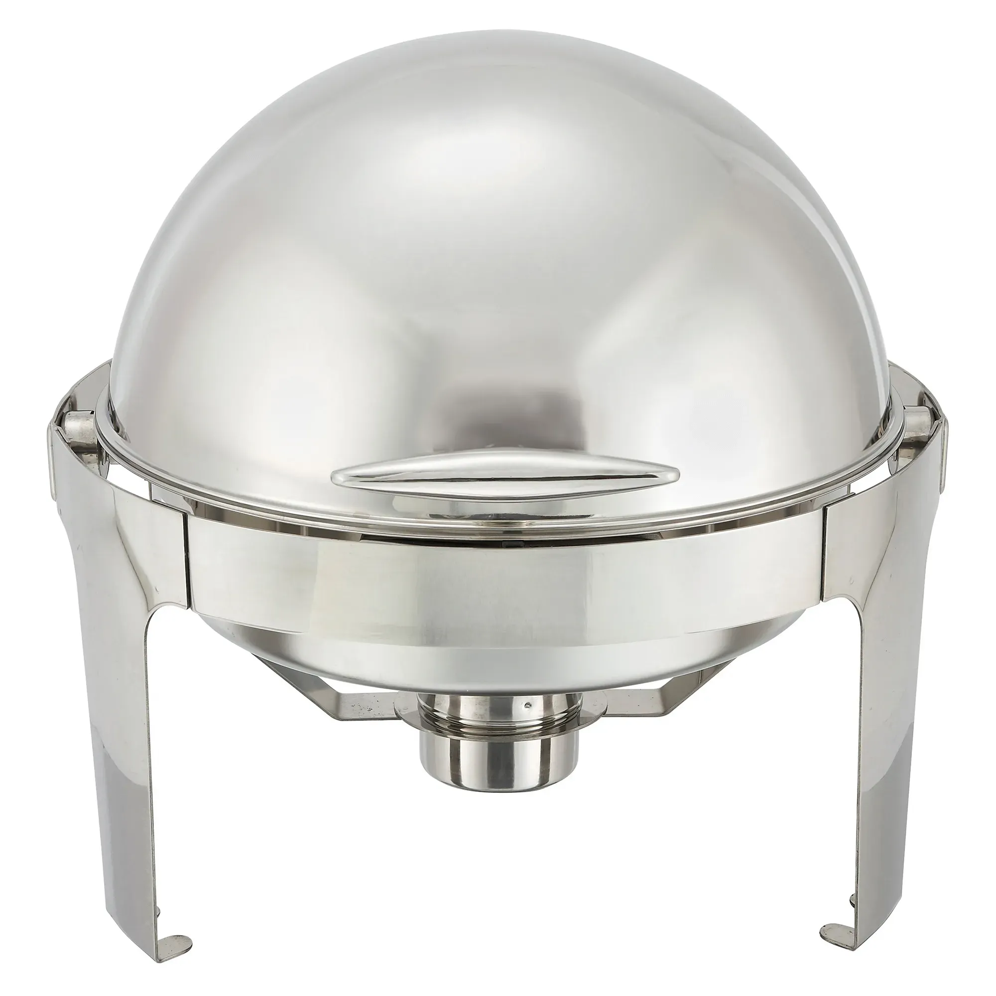 Elevate service with the Madison Chafer 6 qt. round stainless steel frame roll top from Winco. This elegant chafer is designed to enhance the dining experience in any restaurant setting, combining functionality with a sophisticated mirror finish that adds a touch of class to your buffet or catering presentation.