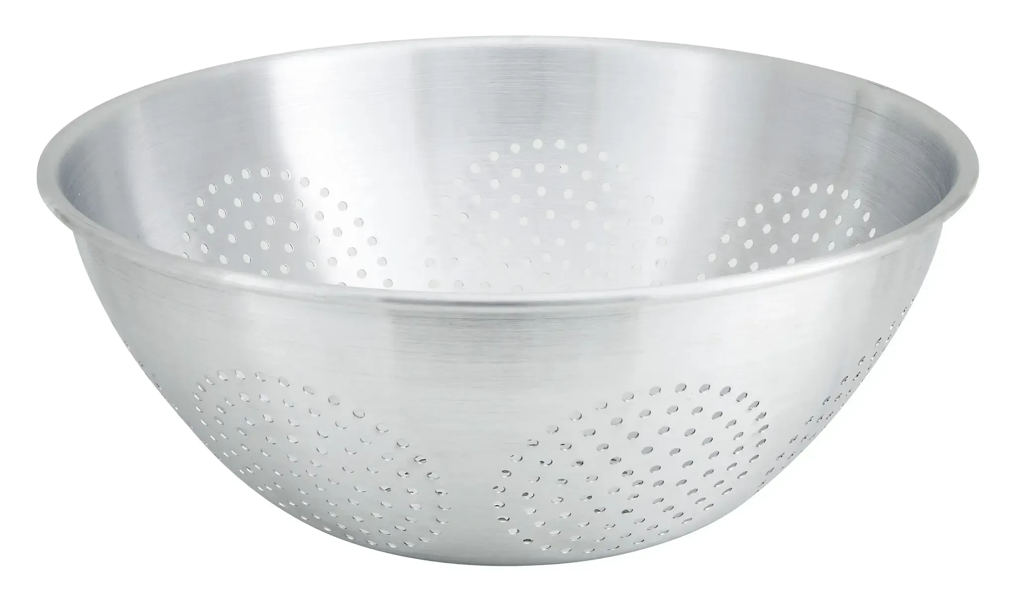 Experience the difference in quality with the Winco Chinese Colander. Designed specifically for the demanding environment of a professional kitchen, this 12-quart colander is an essential tool for any restaurant looking to streamline its food preparation process. Crafted from durable aluminum, the Winco Chinese Colander boasts a generous 12-quart capacity, making it perfect for handling large quantities of ingredients. Its dimensions, 13-1/2 inches in diameter and 5-1/2 inches in height, provide ample space for rinsing, draining, and straining a variety of foods, from pasta and vegetables to seafood and more. The round shape of the colander ensures even distribution of contents, allowing for efficient and thorough draining. The aluminum construction not only makes it lightweight and easy to handle but also ensures it is resistant to rust and corrosion, promising longevity and reliability in a busy kitchen setting. Whether you are preparing a large batch of fresh produce or draining cooked pasta, the Winco Chinese Colander is designed to meet your needs with ease and efficiency. Its robust build and practical design make it a valuable addition to any restaurant's kitchen arsenal. Elevate your kitchen operations with the Winco Chinese Colander and experience the perfect blend of functionality and durability. This colander is not just a tool; it’s an investment in quality and efficiency for your restaurant.