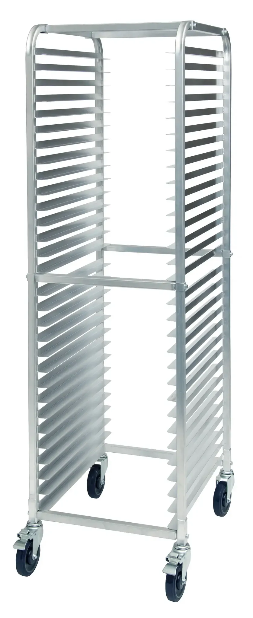 Crafted from durable aluminum, the Winco Sheet Pan Rack is built to withstand the rigors of a high-volume kitchen environment. The 2-inch runner spacing provides ample room for efficient storage and retrieval of pans, streamlining your kitchen operations. The rack is equipped with four 5-inch heavy-weight swivel casters, two of which feature brakes, offering both mobility and stability as needed.