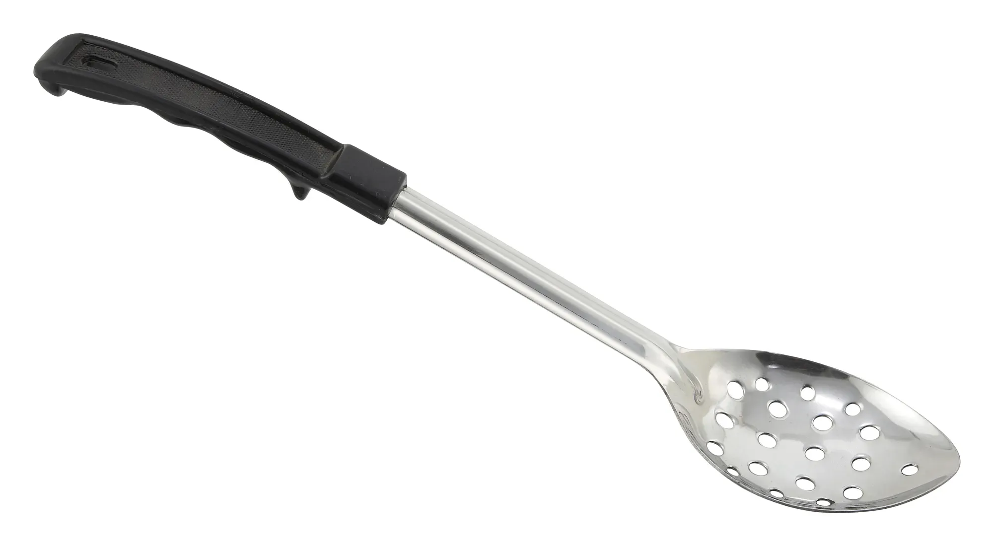 Transform the cooking experience with the Winco Basting Spoon. This 13-inch long perforated basting spoon is designed to meet the high demands of a bustling restaurant kitchen. Crafted from premium stainless steel, it ensures durability and longevity, making it a reliable tool for chefs and kitchen staff alike. The perforated design of the Winco Basting Spoon allows for efficient draining of liquids, making it perfect for basting meats, serving vegetables, or skimming broths. The black plastic handle provides a comfortable and secure grip, reducing hand fatigue during extended use. Additionally, the handle is designed to stay cool, ensuring safety and ease of use even in the hottest kitchen environments. Certified by NSF, the Winco Basting Spoon meets the highest standards of safety and hygiene, making it an essential tool for any professional kitchen. The 13-inch length offers the perfect balance between control and reach, allowing chefs to maneuver with precision and ease. Whether you are basting a roast, serving delicate dishes, or skimming soups, the Winco Basting Spoon is the ideal choice for enhancing your culinary creations. Its robust construction and thoughtful design make it a must-have for any restaurant looking to elevate its kitchen tools. Invest in the Winco Basting Spoon today and experience the difference in quality and performance that it brings to your kitchen.