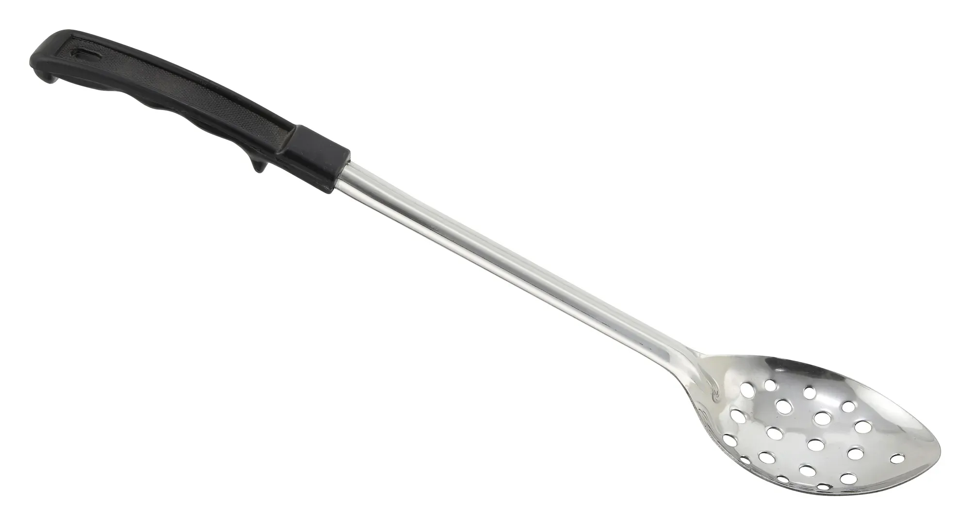 Durable and reliable with a sleek design, the Winco Basting Spoon is an essential tool for any professional kitchen. Measuring 15 inches long, this perforated basting spoon is crafted from high-quality stainless steel, ensuring longevity and resistance to corrosion. The perforations allow for efficient draining of excess liquids, making it perfect for basting meats, serving vegetables, or skimming broths. The black plastic handle is ergonomically designed to provide a comfortable grip, reducing hand fatigue during extended use. This feature is particularly beneficial in a busy restaurant setting where efficiency and comfort are paramount. The handle also remains cool to the touch, ensuring safety during high-temperature cooking. Certified by NSF, the Winco Basting Spoon meets rigorous public health standards, making it a trustworthy addition to your kitchen arsenal. The 15-inch length offers ample reach, allowing chefs to maintain a safe distance from hot surfaces and boiling liquids. While the model number BHPN-15 may not be the first thing you consider, it signifies the specific design and quality that Winco is known for. This model is tailored to meet the demands of a fast-paced restaurant environment, ensuring that it performs reliably under pressure. In summary, the Winco Basting Spoon combines durability, functionality, and safety, making it an indispensable tool for any professional kitchen. Its stainless steel construction, perforated design, and ergonomic handle ensure that it will meet the high standards of any culinary establishment.