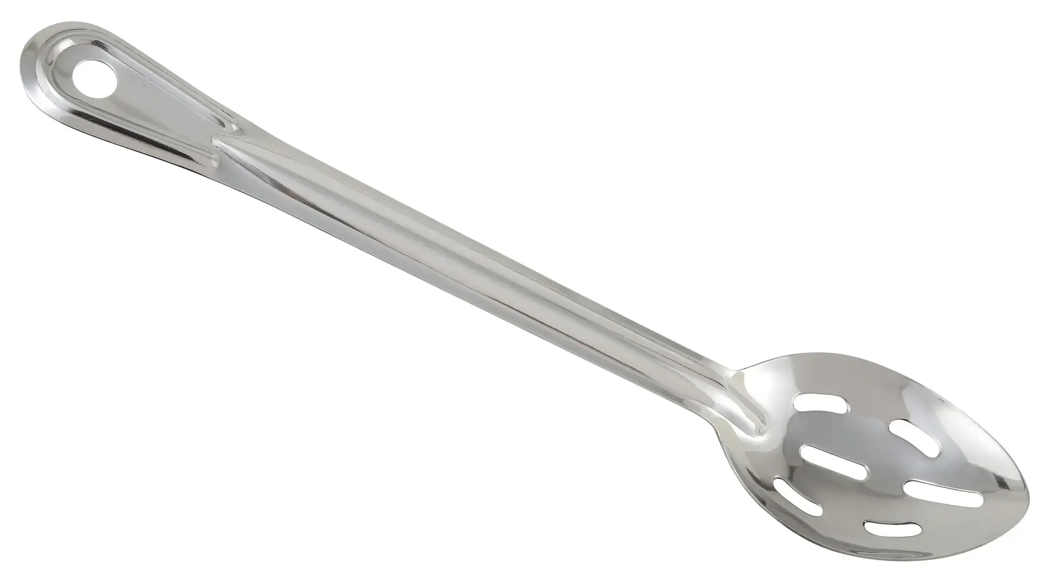 Enhance the cooking repertoire with the Winco Basting Spoon. This essential kitchen tool, measuring 11 inches in length, is designed to meet the rigorous demands of a professional restaurant setting. Crafted from one-piece stainless steel, the Winco Basting Spoon ensures durability and longevity, making it a reliable addition to any culinary arsenal. The slotted design of the Winco Basting Spoon allows for efficient draining of excess liquids, making it perfect for basting meats, serving vegetables, or skimming sauces. Its Prime NSF certification guarantees that it meets the highest standards of safety and quality, providing peace of mind for chefs and kitchen staff. The ergonomic handle of the Winco Basting Spoon offers a comfortable grip, reducing hand fatigue during extended use. Its sleek, polished finish not only adds a touch of elegance to your kitchen but also makes it easy to clean and maintain, ensuring it remains in pristine condition even after frequent use. Whether you're preparing a delicate sauce or basting a roast, the Winco Basting Spoon is an indispensable tool that enhances efficiency and precision in the kitchen. Its robust construction and thoughtful design make it a versatile and valuable asset for any restaurant, ensuring that every dish is prepared to perfection. Invest in the Winco Basting Spoon and elevate your culinary creations with ease and confidence.