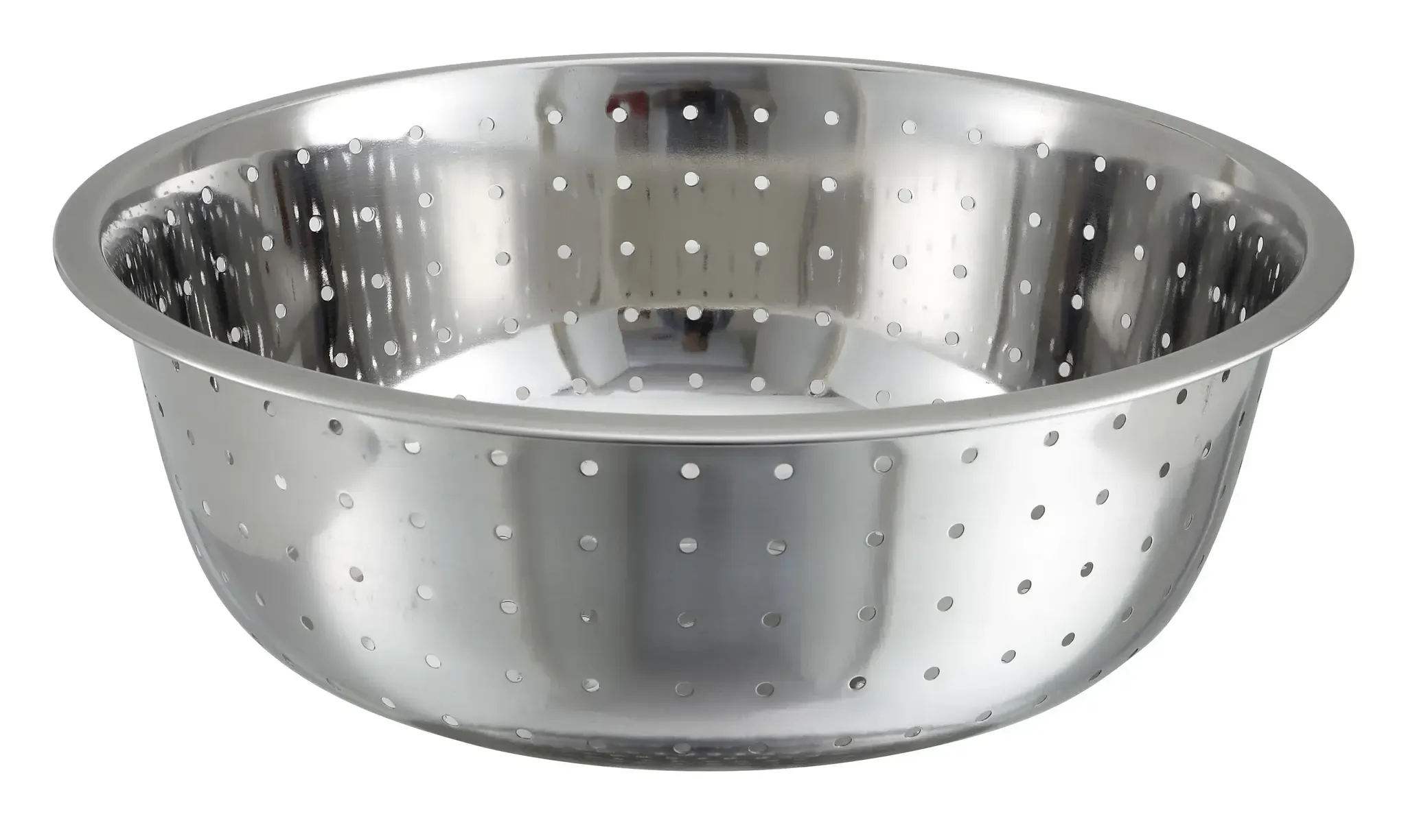Make every dish extraordinary with the Winco Chinese Colander. Designed with a 15-inch diameter and 5mm holes, this stainless steel colander is an essential tool for any professional kitchen. Its generous size allows for efficient draining of large quantities of pasta, vegetables, or any other ingredients, making it perfect for high-volume restaurant settings.