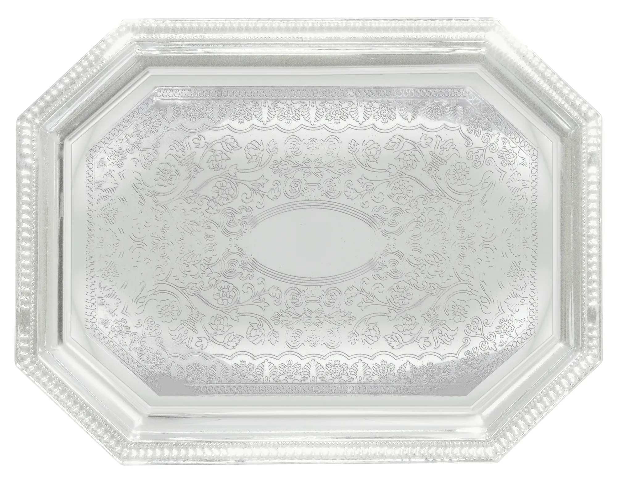 Elevate service with the Winco Serving Tray, a perfect blend of elegance and functionality designed to enhance your restaurant's dining experience. This exquisite tray, measuring 17 x 12-1/2 inches, features an octagonal gadroon edge that adds a touch of sophistication to any presentation. The traditional engraving on the chrome-plated surface not only enhances its visual appeal but also reflects the high standards of your establishment.