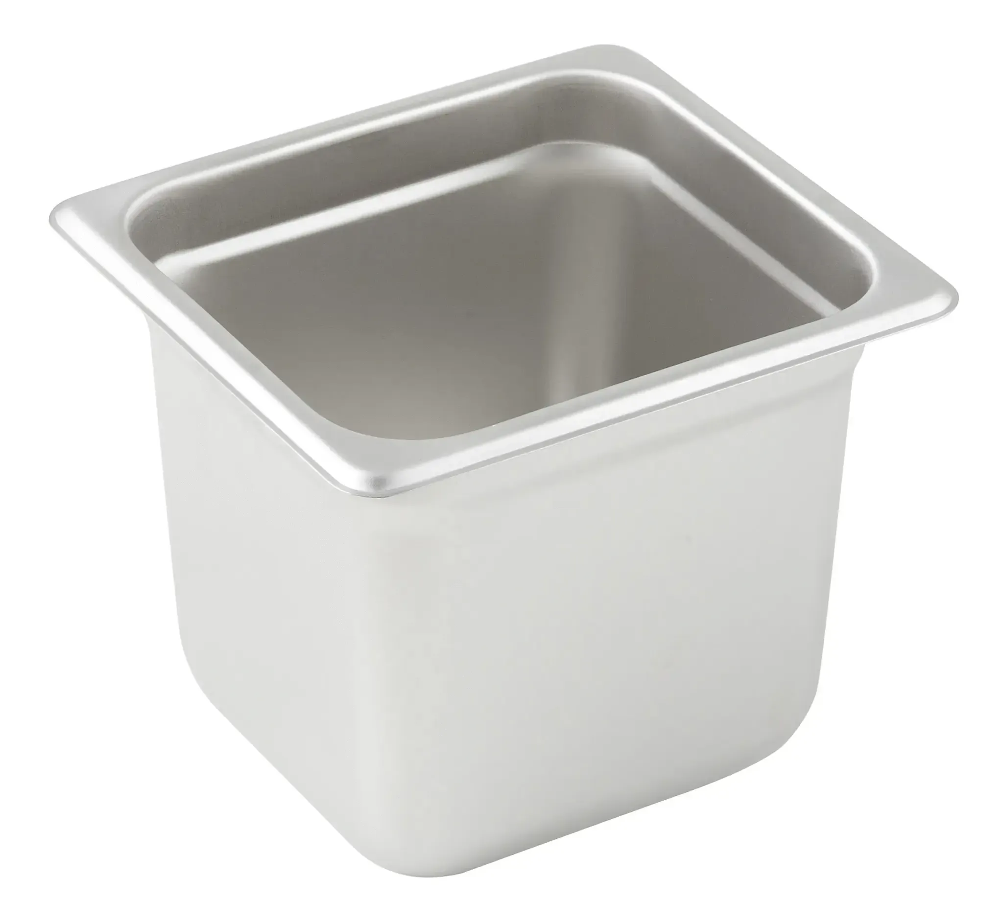The Winco Steam Table Pan boasts a 16 size with dimensions of 6-7/8 x 6-5/16 x 6 inches deep, providing ample space for a variety of dishes. Constructed from 25 gauge standard weight 18/8 stainless steel, this pan ensures long-lasting performance and resistance to corrosion, making it ideal for both hot and cold food storage.