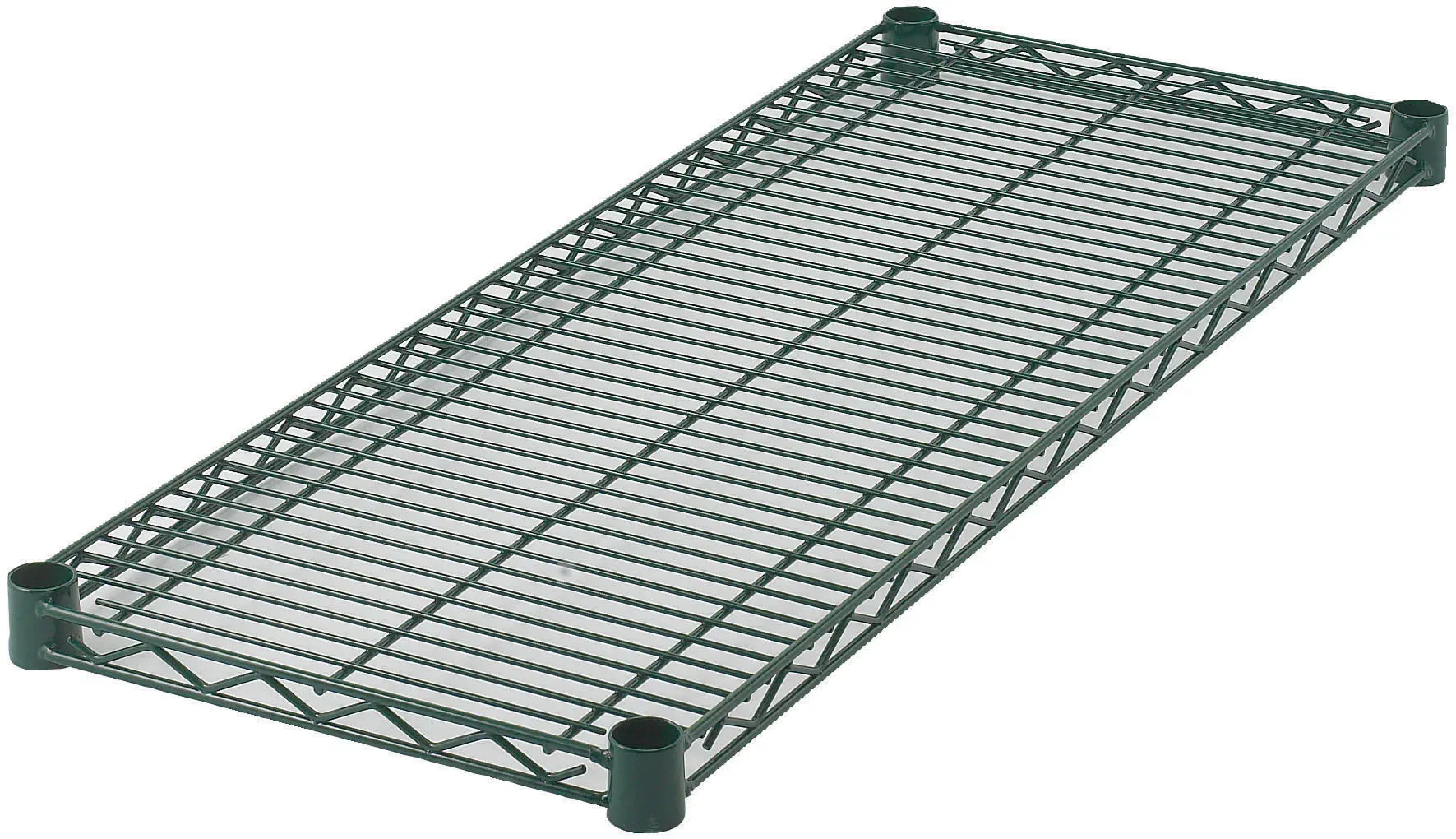The epoxy-coated green finish not only adds a touch of color to your storage area but also offers excellent resistance to corrosion and rust, making it ideal for the demanding environment of a commercial kitchen. This coating ensures that the shelf remains in pristine condition, even in humid or wet conditions, thereby extending its lifespan and maintaining its aesthetic appeal.